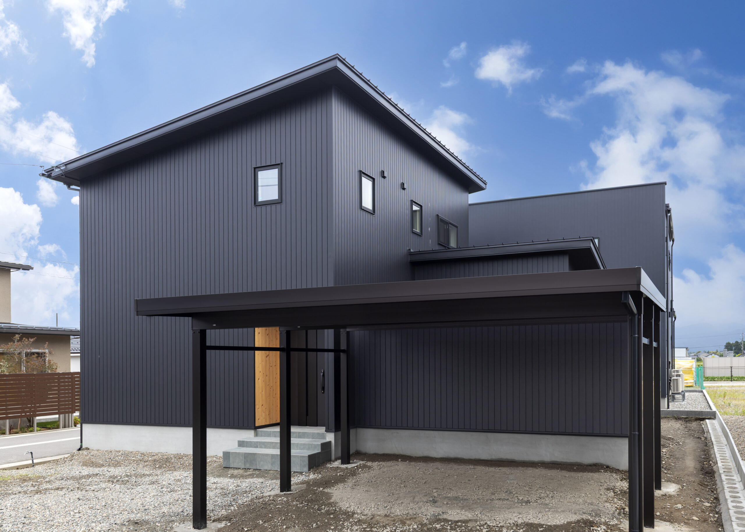 重厚感のあるブラックの外壁がとってもカッコイイ二階建てのお家です。
